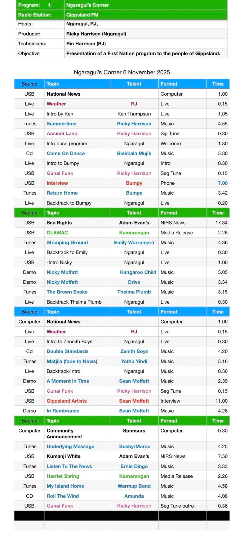 Below a copy of the program sheet for the first radio broadcast of 'Ngaragul's Corner' on Gippsland FM 104.7. Thursday 6 November 2025.